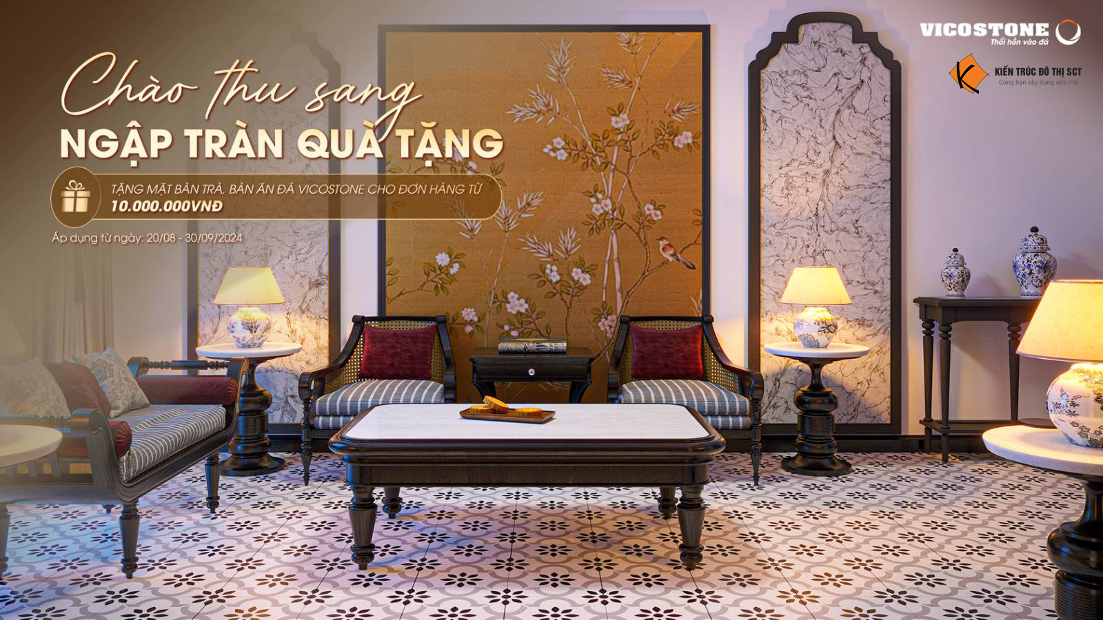 Với mong muốn đồng hành cùng quý khách hàng trên hành trình kiến tạo không gian sống lý tưởng và ấm cúng trong mùa thu này, VICOSTONE® triển khai chương trình ” ĐÓN CHÀO THU SANG – NGẬP TRÀN QUÀ TẶNG”. Chương trình diễn ra từ ngày 20/08 đến hết 30/09/2024, với nhiều món quà hấp dẫn và giá trị.